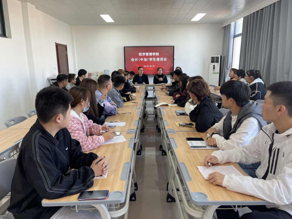 为进一步了解首届中外合作办学项目的管理水平和办学满意度,2021年11月11日下午,米乐mile官方网站召开了中外合作办学项目学生座谈会。米乐mile官方网站张召哲院长、李兆楠书记、学院办公室主任张晓凤、学院教务办主任柴芳芳、团总支书记聂蕴和与会计(中加)2101-2103三个班级的20余名班干部及学生代表参加了座谈会。同学们围绕课程设置、教学安排、课堂管理、课外活动、出国留学、升本就业、后勤服务等畅所欲言,老师们现场积极答疑解惑,座谈会气氛热烈。