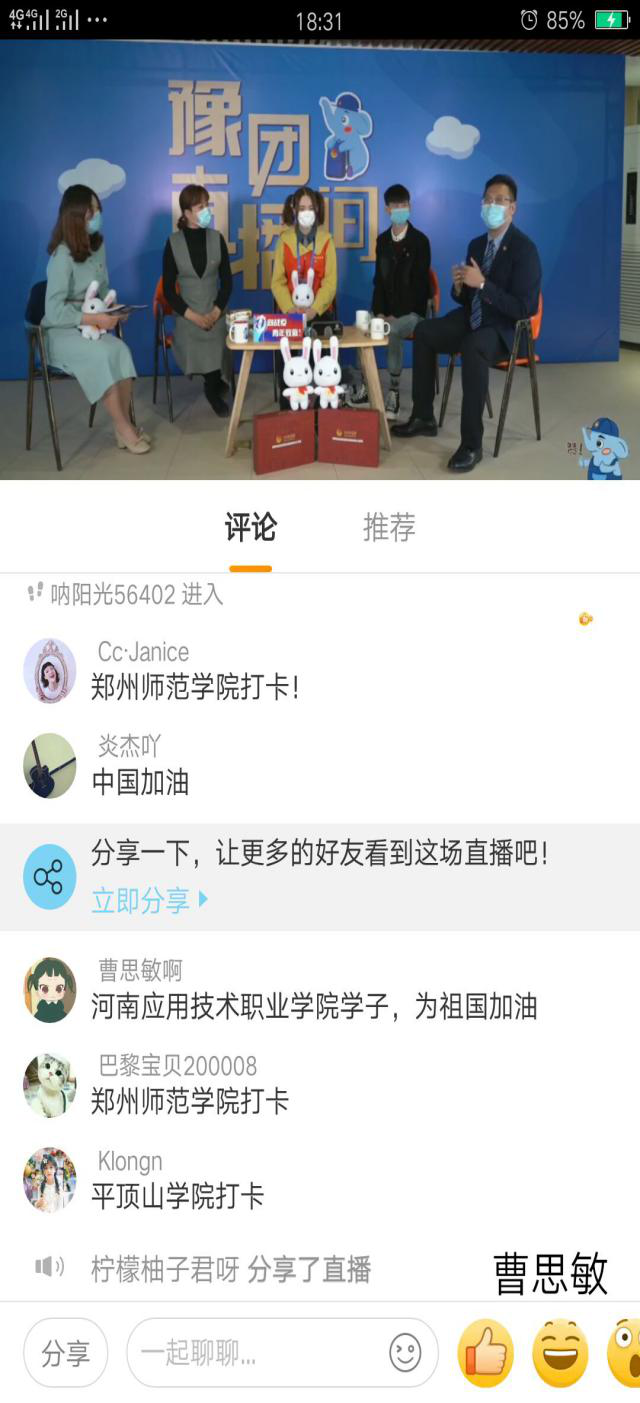 2020年4月9日下午,米乐mile官方网站团总支在校团委的统一部署下,由团总支书记聂蕴老师组织全体学生干部走进豫团直播间,观看“90后的青春答卷”直播活动,聆听抗“疫”故事,重温抗“疫”时刻。米乐mile官方网站团总支将此次学习作为一次生动的主题团日教育活动,鼓励全体学生干部磨砺意志、艰苦奋斗,勇做新时代有为青年。