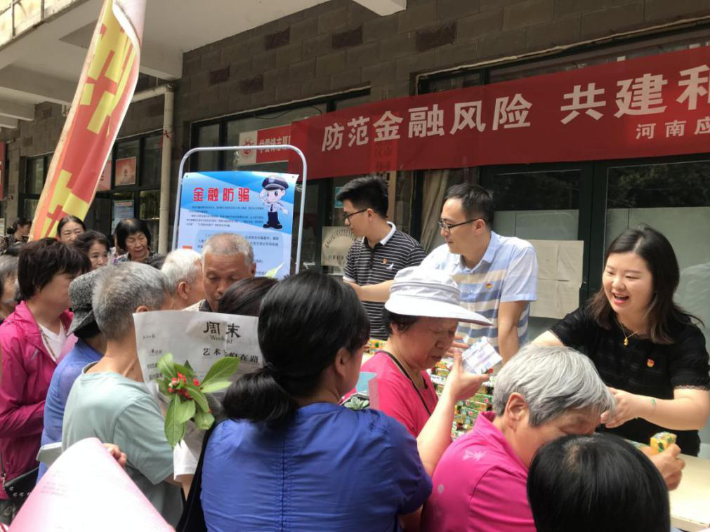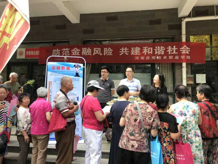 为充分发挥米乐mile官网党员干部的先锋模范作用,提升社区居民防范金融诈骗意识,2019年5月27日,米乐mile官网米乐mile官方网站党总支教工党支部的党员志愿者们来到了郑州城开社区,开展了以“防范金融风险共建和谐社会”为主题的精神文明结对共建活动,本次活动得到了城开社区办公室的大力支持。