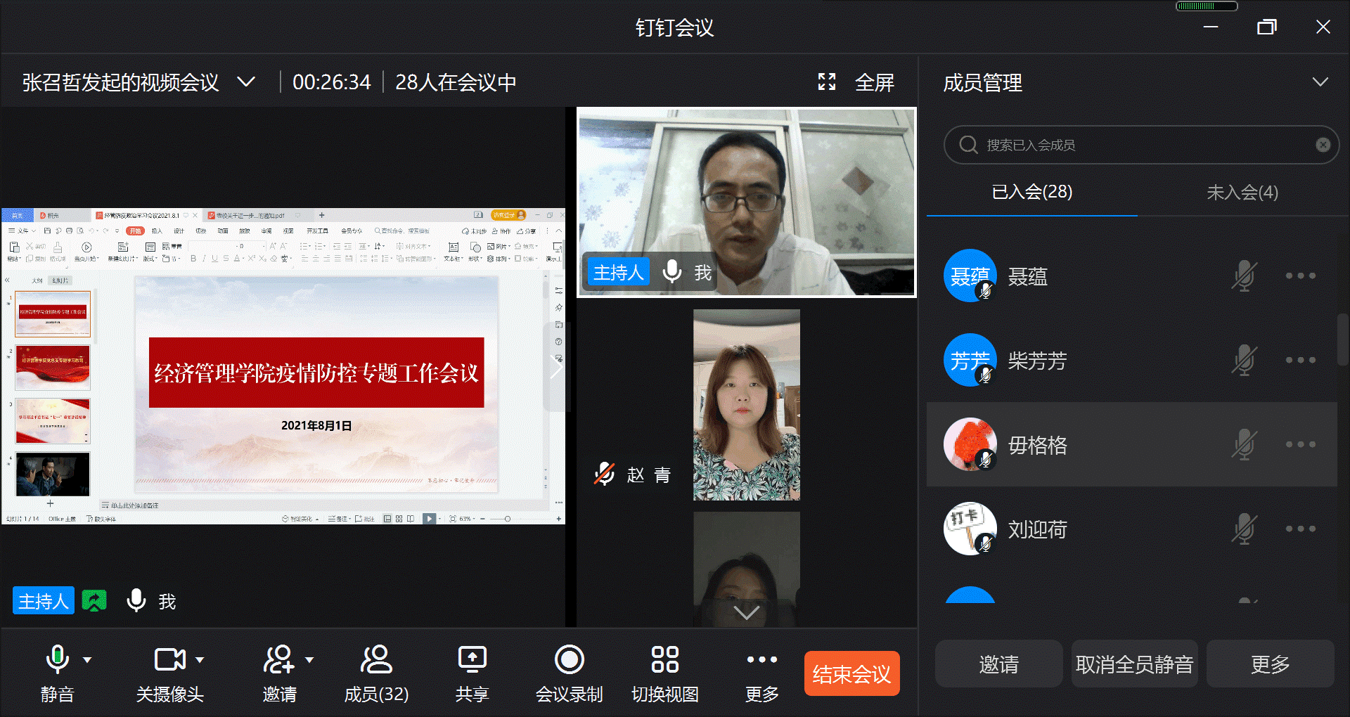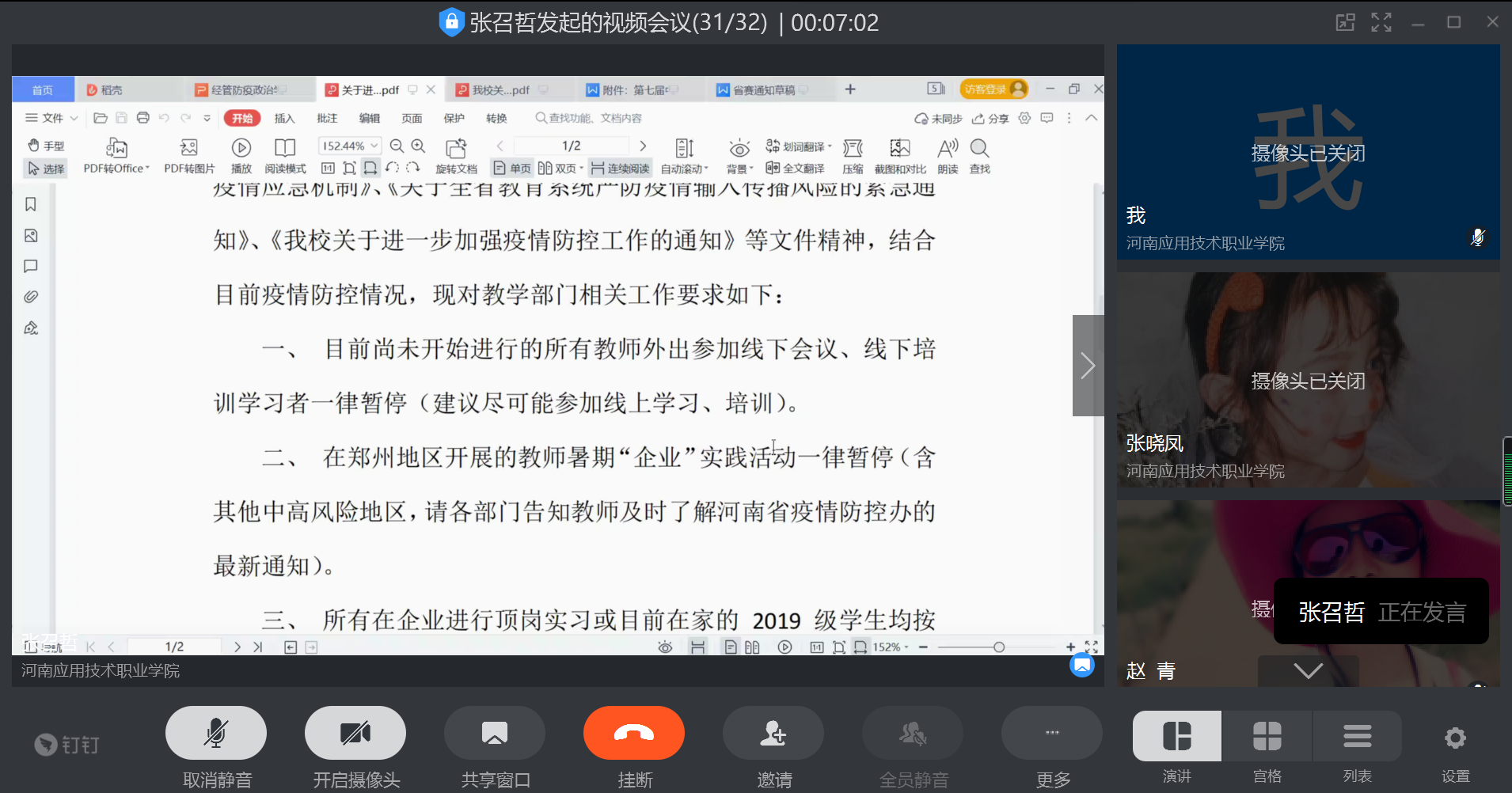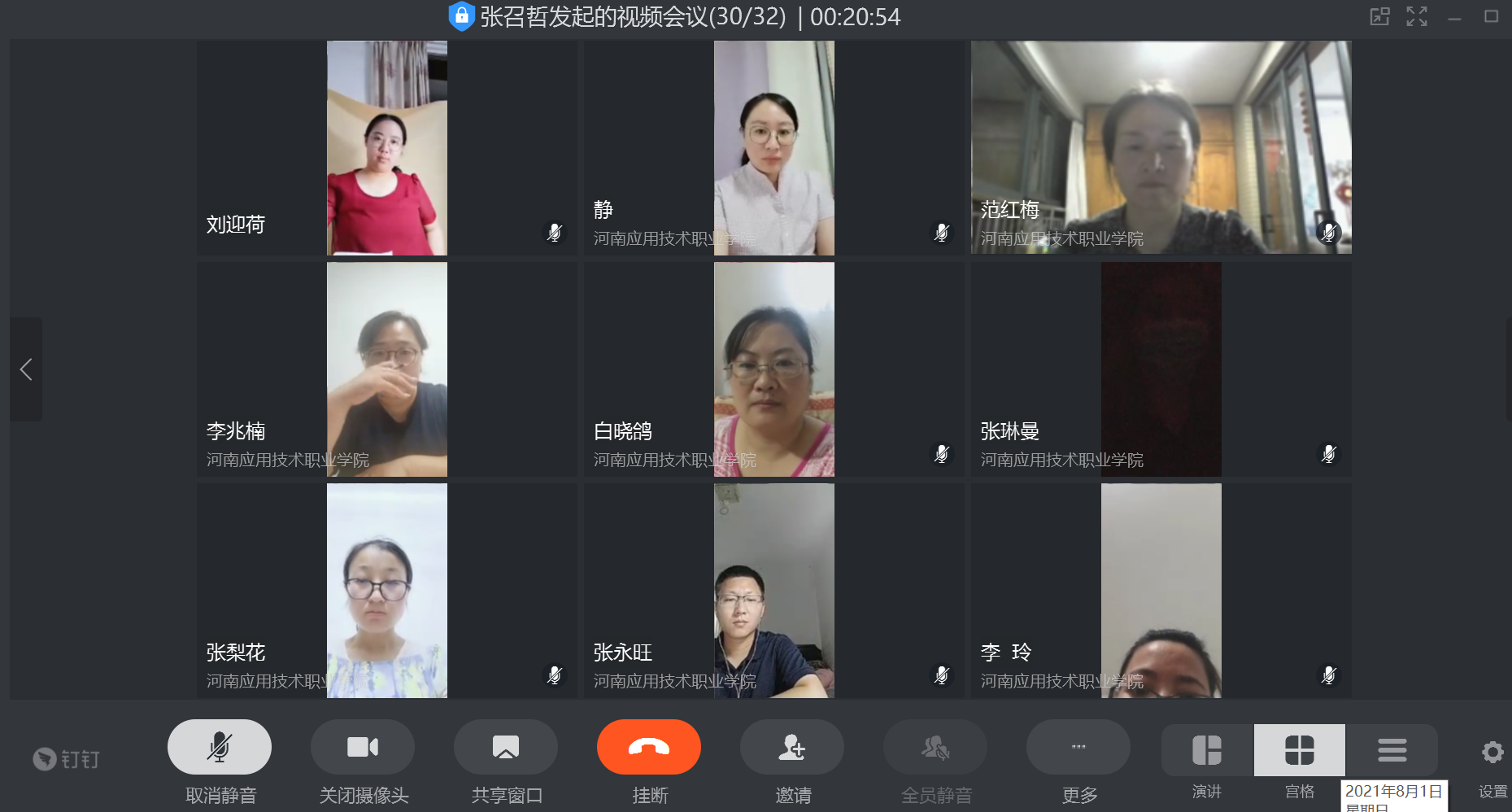 当前,全国多个省份相继出现本土病倒,疫情呈现快速蔓延趋势, 防控形势异常复杂严峻。结合《全省教育系统新冠肺炎疫情防控工作视频会议》安排,根据《河南教育系统立即启动疫情应急机制》、《关于全省教育系统严防疫情输入传播风险的紧急通知》、《米乐mile官网关于进一步加强疫情防控工作的通知》等文件精神,结合目前疫情防控情况,米乐mile官方网站于8月1日晚8点在钉钉平台召开疫情防控专题工作视频会议,对教师企业实践、顶岗学生管理、教学等相关工作提出具体要求,全体专兼职教师参加了此次视频会议。