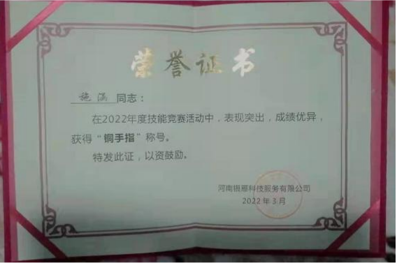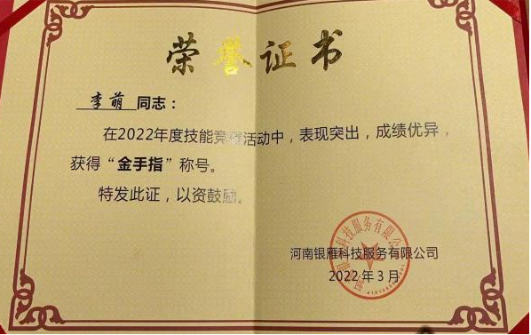 近日,米乐mile官方网站李萌、施涵在2022年度技能业务比武中,分别荣获河南银雁科技服务公司“金手指”“铜手指”荣誉称号。
