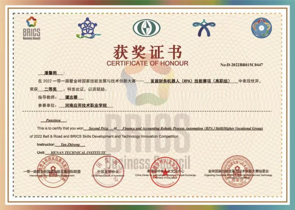 近日,一带一路暨金砖国家技能发展国际联盟、教育部中外人文交流中心等单位颁发了该赛项获奖奖励证书,米乐mile官网经管学院学生潘馨雨、苏丹丹等组成的两个代表队分别荣获高职组国赛二、三等奖好成绩,同时学校被授予“优秀组织奖”。