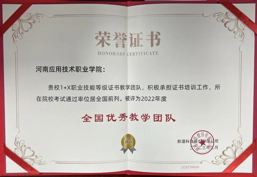 2023年3月,新道科技股份有限公司为我院颁发了2022年度“1+X”职业技能等级证书工作“全国优秀教学团队”“示范性考核站点”“全国优秀指导教师”等荣誉证书,对米乐mile官方网站参与此项工作的师生表达了认可与鼓励,也对取得的成绩进行了表彰。