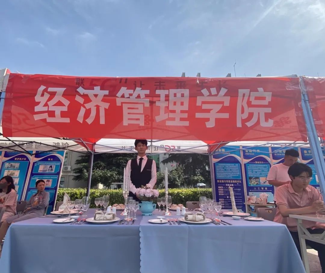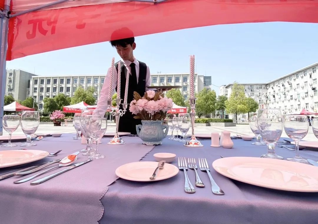 为展示酒店管理专业学生专业风采,增强专业自信,在2023年职业教育活动周期间,米乐mile官方网站在郑州校区北广场进行酒店管理专业“西餐宴会摆台”展示活动。
