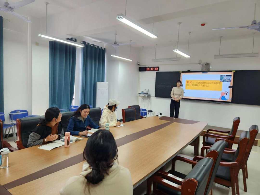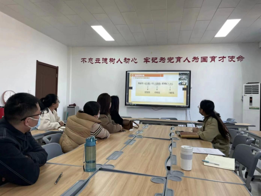 本次青年教师公开课采取集体观看和评课的方式,老师们集体观看了马子芊老师讲解的《复利的现值和终值计算》。马老师精心设计了问题导入,通过PPT演示、板书,小组讨论等方式带领大家了解资金时间价值的概念以及复利现值和终值的计算。讲解过程中通过引入实际生活中的案例,布置练习任务等可以加深学生们对知识的理解。最后通过引入课堂思政环节来呼吁学生们进行合理的投资。马老师采取多样的方法引导学生及时掌握、巩固知识点,使学生能够全神贯注于课堂,课堂氛围更加真实活跃。