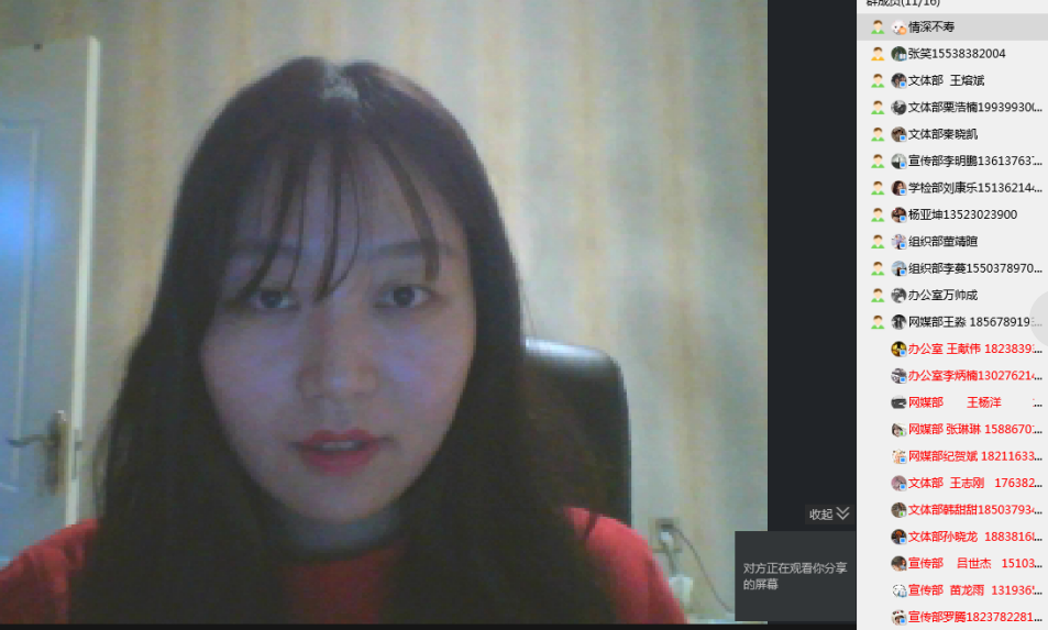 会议伊始,聂老师与大家温情寒暄。她肯定了全体学生干部对上一学期各项工作的辛勤付出,表达了对全体成员的感谢。接着,接着从疫情防控、线上学风督导及学生组织活动三个方面进行了相关说明。