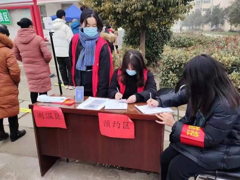 会计2101班蒋琳琳,2022年1月9日报名参加了河南省漯河市郾城区商桥镇大闫社区的大学生志愿服务活动。1月10日,她协助社区组织大闫社区的第一次核酸检测,她与其他志愿者一起维持现场秩序,帮助村民登记信息,为村民答疑解惑,提醒村民做好防护,积极配合核酸检测工作。