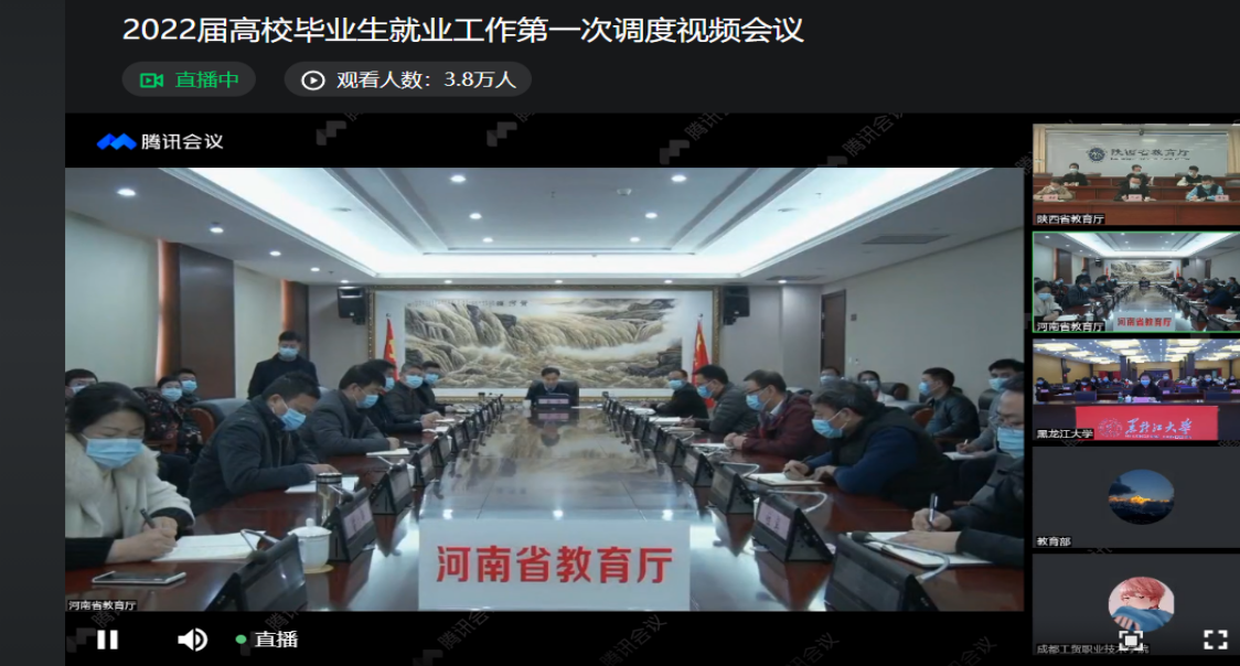 2022年1月18日下午14:30,教育部、人力资源社会保障部召开2022届全国普通高校毕业生就业工作第一次调度视频会议。河南省教育厅吕冰、四川省教育厅戴作安、陕西省教育厅高岭、电子科技大学申小蓉、中国政法大学李秀云、黑龙江大学丁宏、合肥职业技术学院王杰才,代表单位作了交流发言,介绍了本单位落实全国2021届高校毕业生就业工作会议精神、推进毕业生就业的工作情况。全国就业指导中心副主任宁小华认真总结了2021届高校毕业生就业工作,分享了全国就业指导中心在促进2022届高校毕业生稳就业促就业工作举措。最后,学生司副司长吴爱华肯定了2021届高校毕业生就业工作,分析了2022届高校毕业生就业形势及当前工作进展,安排了下一步就业工作部署。米乐mile官方网站组织全体学工人员及毕业班辅导员通过线上观看直播的方式参加了本次视频会议。