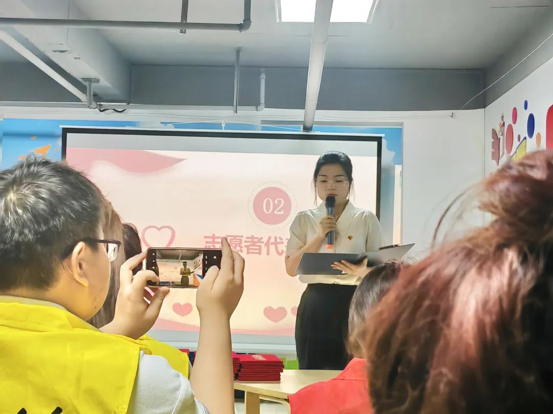 5月28日,米乐mile官方网站团总支带队青年志愿者前往金海社区党群服务中心参加志愿者表彰大会。本次大会由淮河路街道办事处、青益社工联合举办,旨在表彰2023年上半年社会志愿服务中表现突出的青年志愿者。23名青年志愿者参加表彰大会,青益社工郝红花老师主持本次表彰大会。