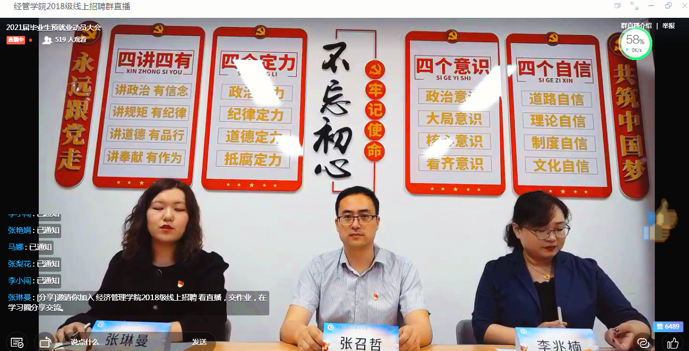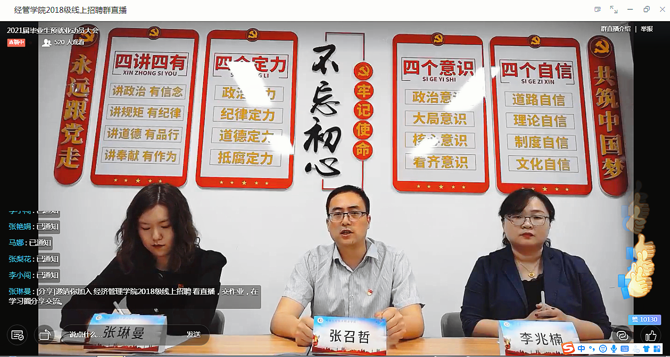 5月14日,经管学院采用直播的形式召开了2021届毕业生顶岗实习云动员大会暨就业指导系列活动启动仪式。院长张召哲、书记李兆楠、团总支书记聂蕴、学工办主任张琳曼、2018级全体辅导员老师和520余名学生参加了此次会议。