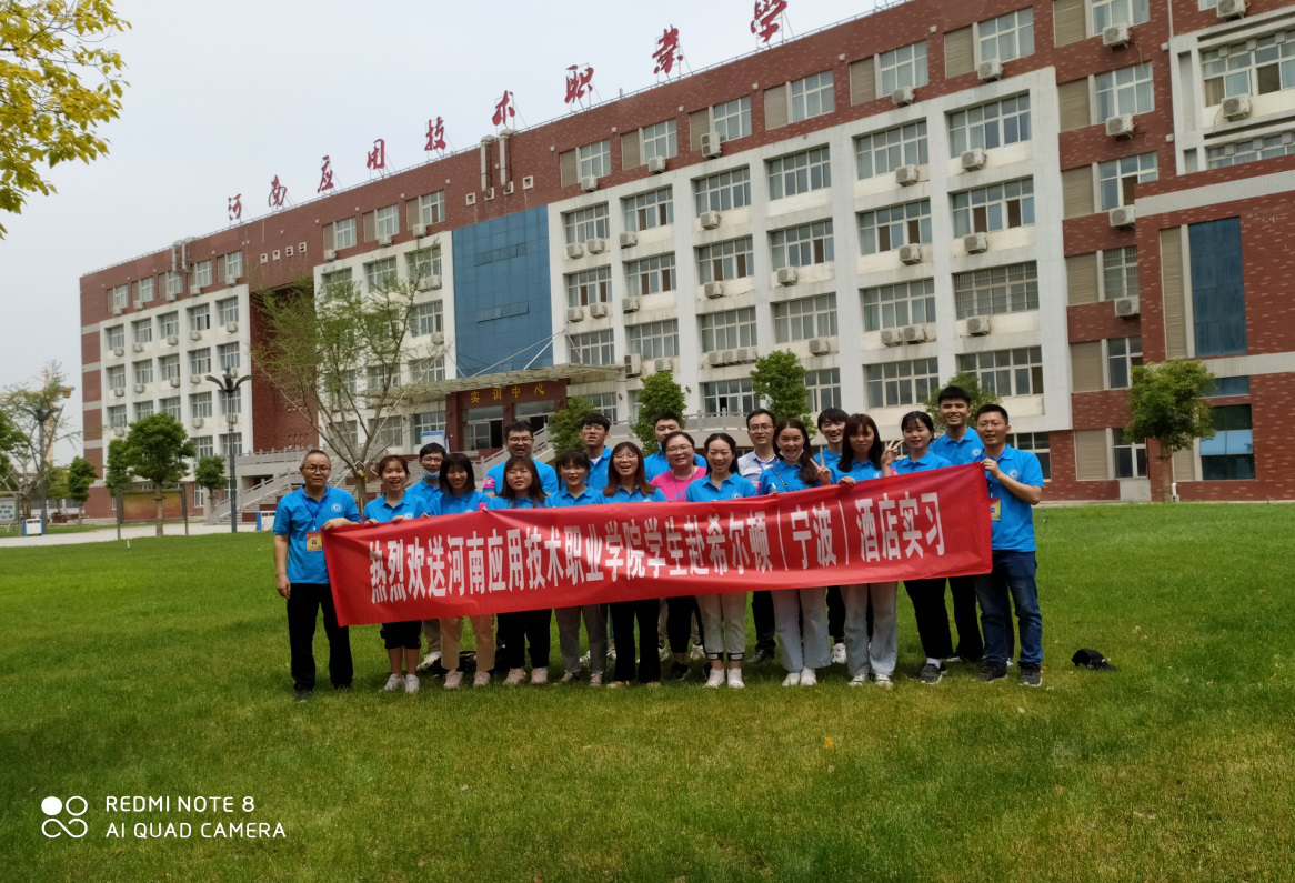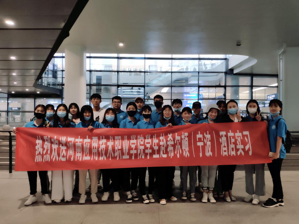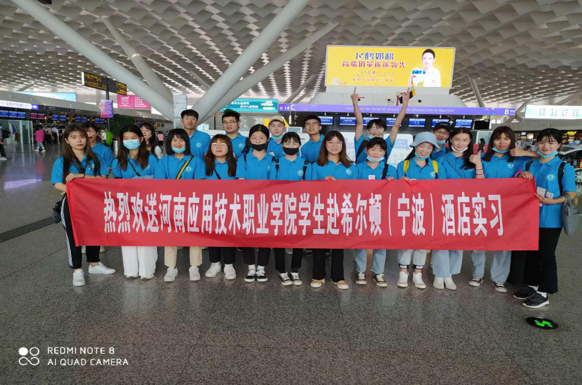 2020年6月5日,河南应用技术职业学米乐mile官方网站20名学生及2名带队教师,身着统一工装,在学校实训大楼前开心合影。随后统一乘车前往新郑机场,搭乘由希尔顿集团统一安排的航班前往其宁波酒店顶岗实习。