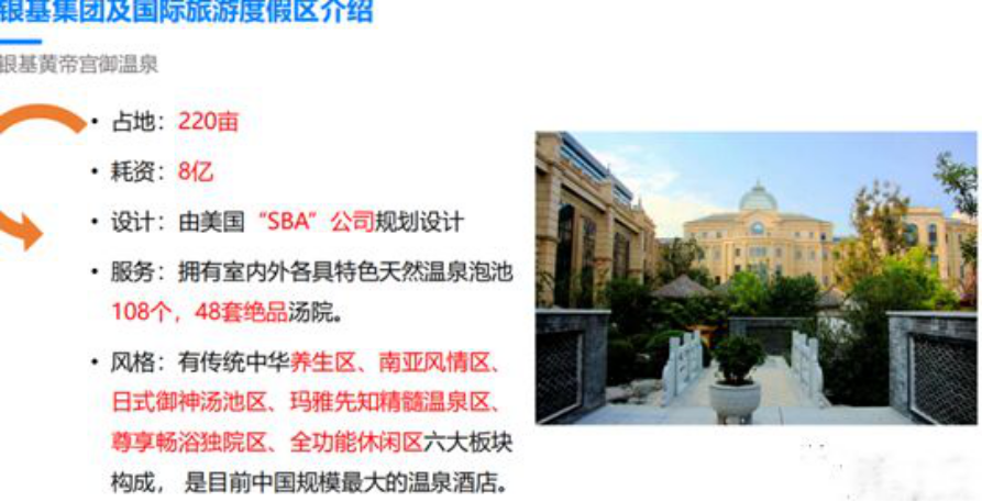 ??银基商贸城、文化旅游板块、丹尼尔物业、能源板块、金融板块等均呈现出良好发展态势银基国际旅游度假区由银基集团开发建设,项目位于郑州西南,距郑州高铁站?37?公里,新郑国际机场?25?公里,郑尧高速、郑登快速路、商登高速三条区域快速路穿境而过,规划中的郑洛城际轻轨、地铁7号线延长线,畅连新郑国际机场,构筑快速融城度假圈,交通极为便利。项目规划面积?1.6?万亩,目前已建成项目有银基黄帝宫御温泉、银基乐海水世界、银基冰雪世界,在?建项目有银基动物王国、银基冰雪酒店、银基滨海湖商业街、银基海底世界等。