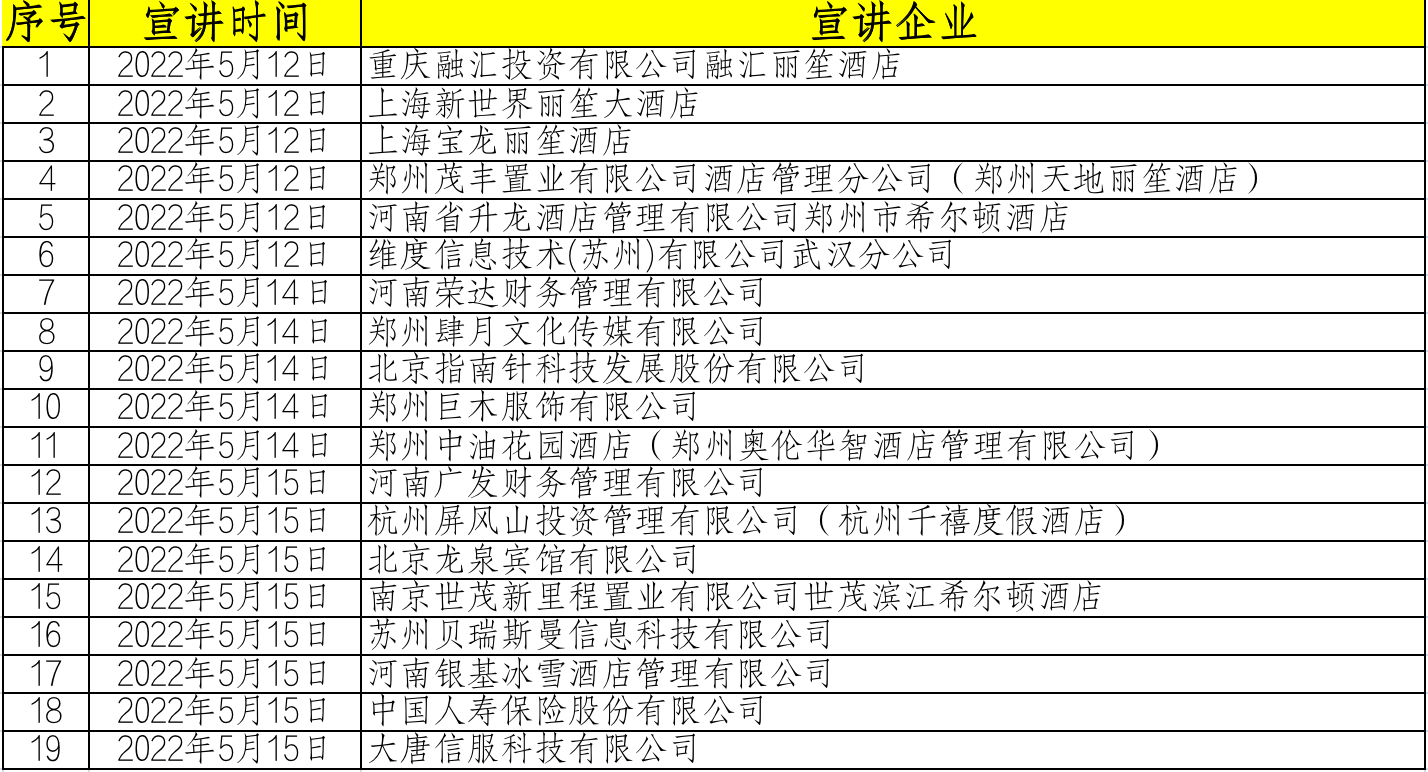 河南广发财务管理有限公司、杭州屏风山投资管理有限公司(杭州千禧度假酒店)、北京龙泉宾馆有限公司、南京世茂新里程置业有限公司世茂滨江希尔顿酒店、苏州贝瑞斯曼信息科技有限公司、河南银基冰雪酒店管理有限公司、中国人寿保险股份有限公司、大唐信服科技有限公司等8家企业受邀进行宣讲。