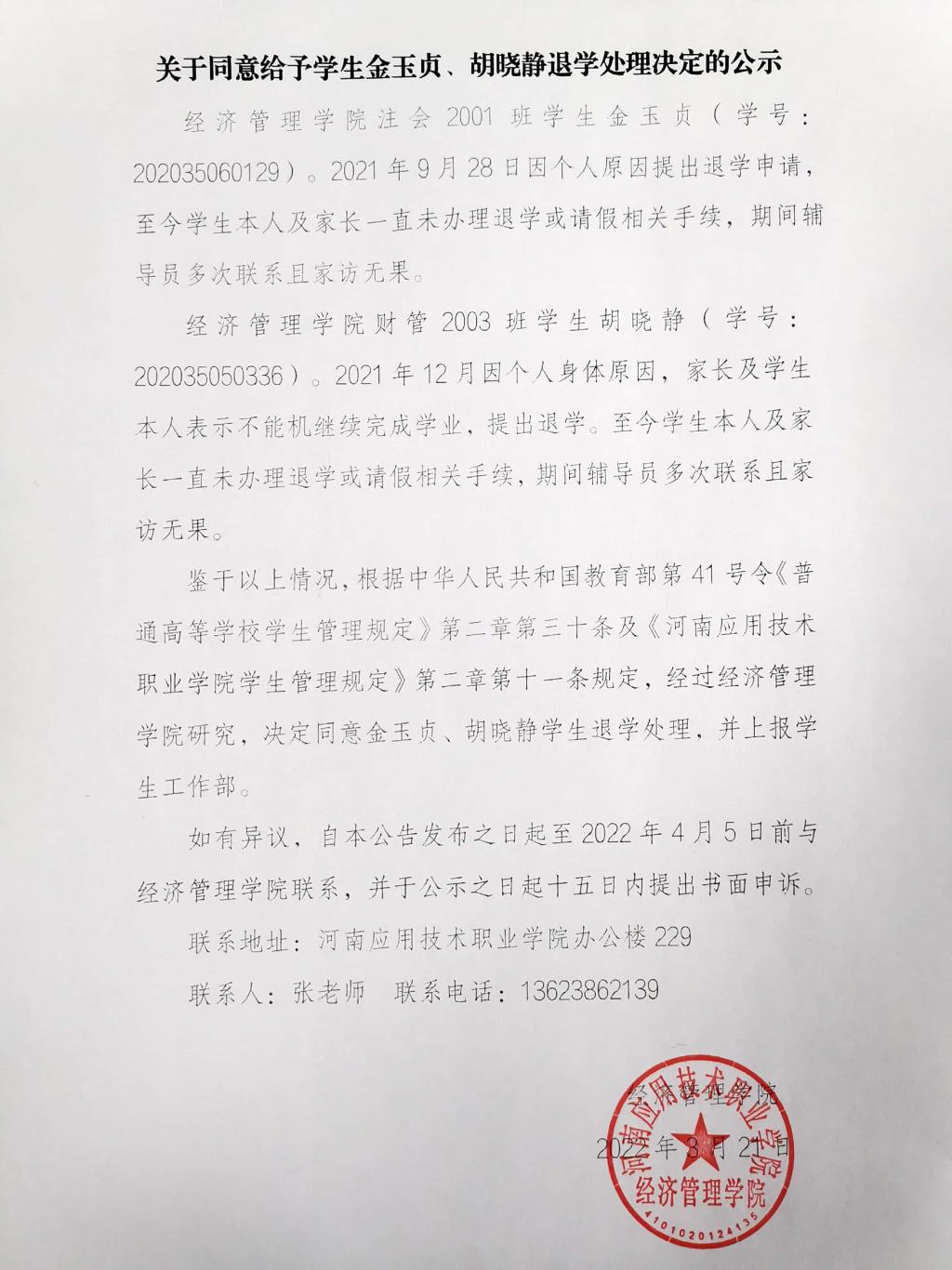 关于同意给予学生金玉贞、胡晓静退学处理决定的公示
