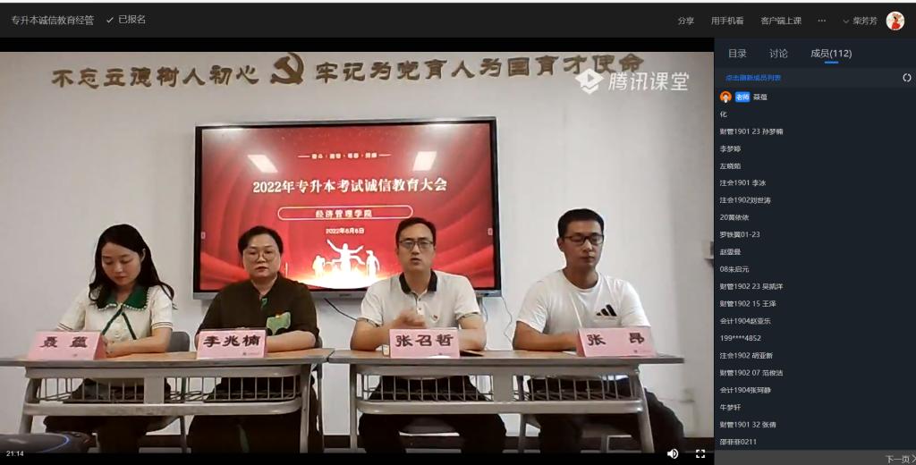 为提高2022年专升本考生诚信意识,培养考生诚信品质,营造诚信、自律、自强校园文化氛围。2022年6月6日下午,通过腾讯课堂,米乐mile官方网站米乐mile官方网站召开2022年专升本考试诚信教育大会。会议由团总支书记聂蕴主持,165名专升本考生参加会议,院长张召哲、书记李兆楠、学工办主任张昂出席会议。