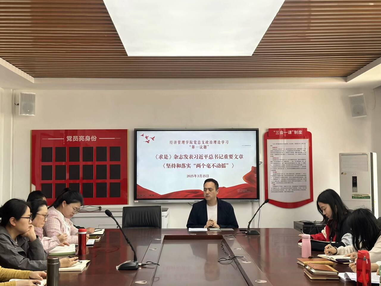 会上,全体教师集中学习了习近平总书记重要文章《坚持和落实“两个毫不动摇”》和《习近平文化思想学习纲要》——推动文化繁荣、建设文化强国相关内容。在深入研读的过程中,教师们领悟到,坚持和完善我国基本经济制度,是坚持和发展中国特色社会主义的必然要求;同时表示,要将文化建设的重要理念融入日常教学,培育学生的文化自信和民族自豪感,引导学生树立正确的文化观。