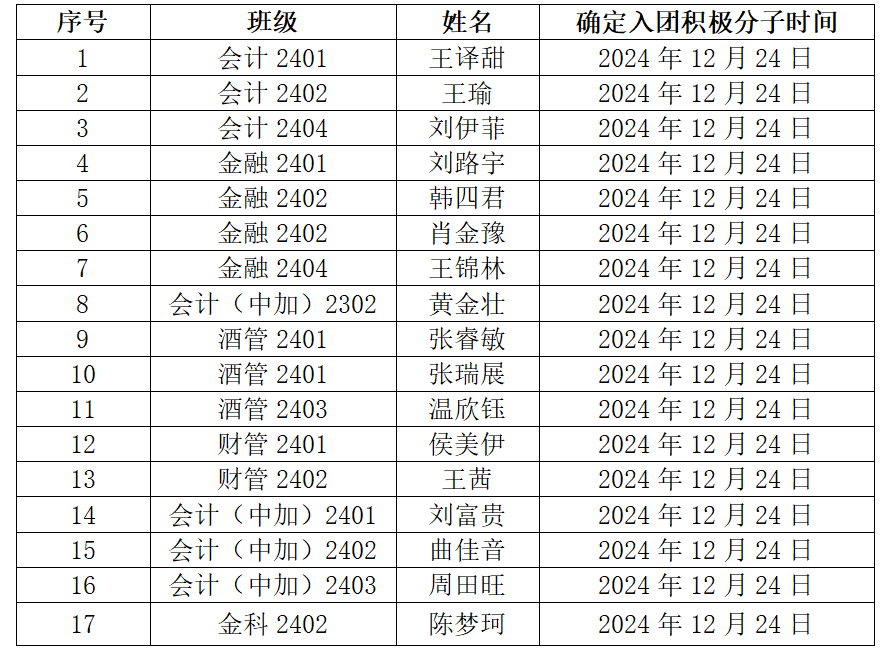 根据《中国共产主义青年团章程》中对发展团员的要求及《发展团员工作细则》等有关规范,严格落实推优入团、评议入团等制度,经学生个人自主申请,各团支部民主推荐,米乐mile官方网站团总支严格按照新发展团员条件及本人综合表现情况,拟确定王译甜等17名同学为本次团员拟发展对象。现进行公示: